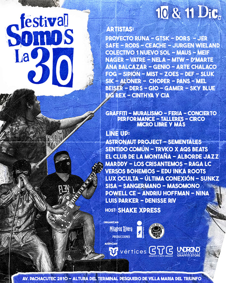 No te pierdas y asiste al Festival Somos la 30, este será el 10 y 11 de diciembre frente al terminal pesquero de Villa María del Triunfo (entre la estación del tren Villa María y Mateo Pumacahua).