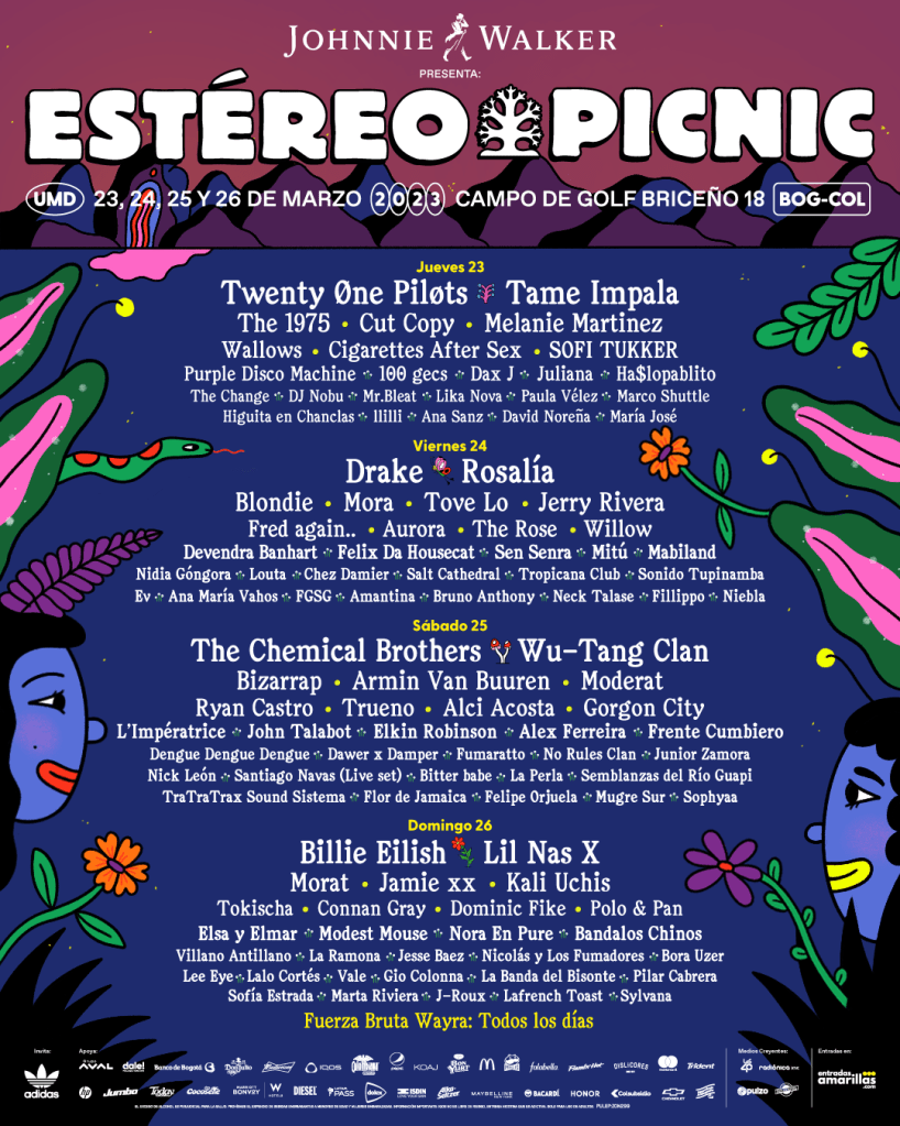 El 23, 24, 25 y 26 de marzo el Campo de Golf Briceño 18 recibirá la duodécima edición del Festival Estéreo Picnic con uno de los mejores carteles festivaleros de 2023: Drake, Billie Eilish, Blink-182, The Chemical Brothers, Wu-Tang Clan, Rosalía, Tame Impala, Blondie, The 1975, Morat, Kali Uchis, Moderat, Bizarrap, Lil Nas X y otrxs protagonistas del #FEP2023. Todxs juntxs en la liberación definitiva de nuestros corazones.