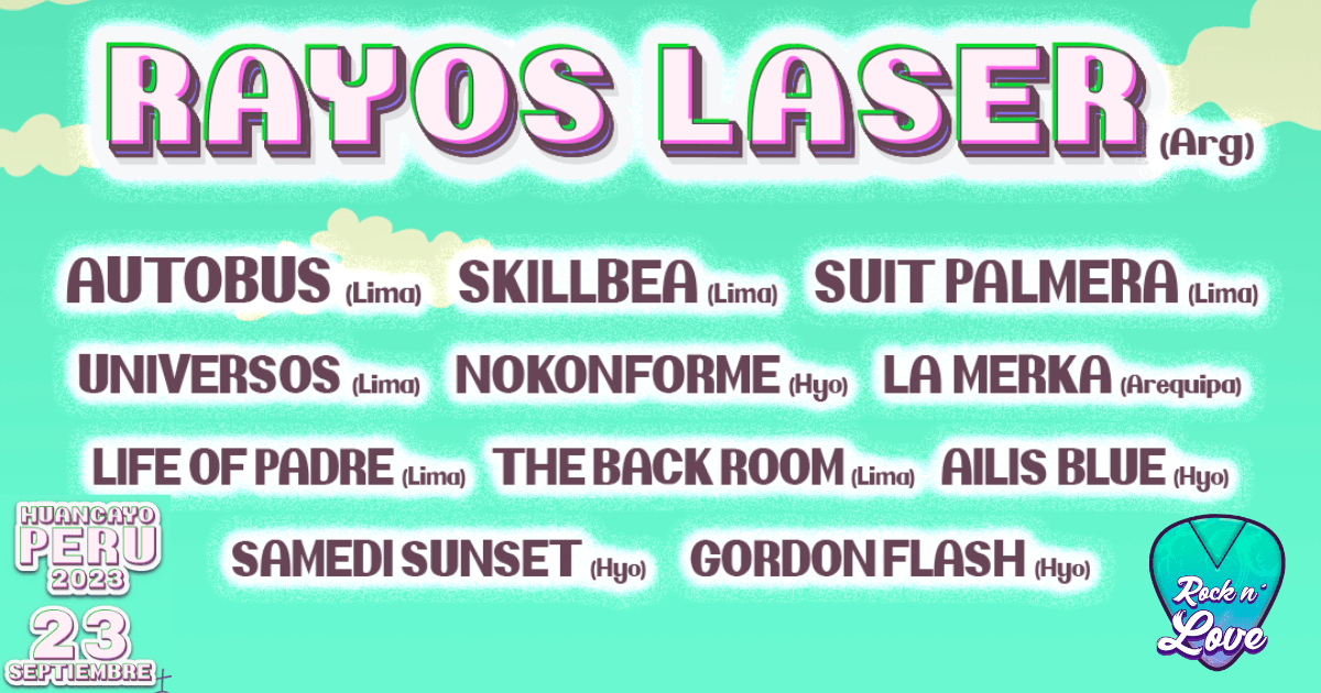 Pero Rayos Láser no estará solo en esta movida. El Festival Rock ‘N Love también contará con la presencia de destacadas bandas nacionales como Autobus, que regresa a Huancayo luego de un año para presentar su reciente álbum ‘Todo bien, nada en orden’, cuarto álbum de su carrera que muestra una evolución en su sonido y en su propuesta lírica; Skillbea, que regresa a ‘La Incontrastable’ para presentar los hits que musicalizan las historias de amor y desamor de una nueva generación de seguidores; Suit Palmera, una de las bandas revelación del indie pop nacional que ya anda calentando motores para presentar su segundo álbum: un combinado de sonoridades que van desde el funk hasta el rock. Así mismo, se suman a esta edición propuestas jóvenes y con muchísimo potencial como Universos, Life of Padre y The Back Room.