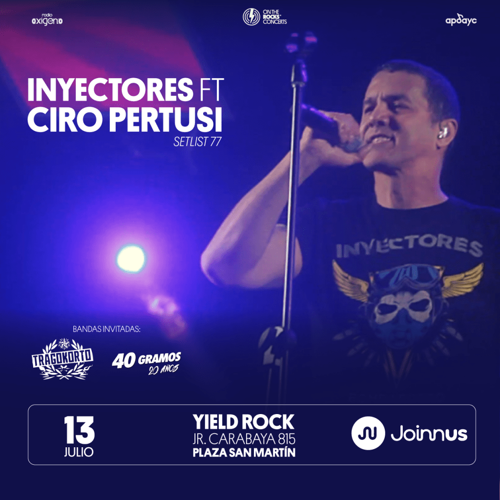 Será una velada repleta de rock, con los mejores temas de Inyectores y un repertorio completo de 17 cacniones las composiciones de Ciro en Attaque 77 . La fusión de la poderosa voz de Ciro con la energía musical y escénica de Inyectores promete un show que dejará una marca imborrable. La banda, integrada por Gonzalo Farfán (voz/guitarra), Gabriel Bellido (bajo), Sergio Bolívar (segunda guitarra) y Sergio «Saito» Chinén (batería), lleva dos décadas siendo uno de los principales exponentes del punk rock en la escena peruana.