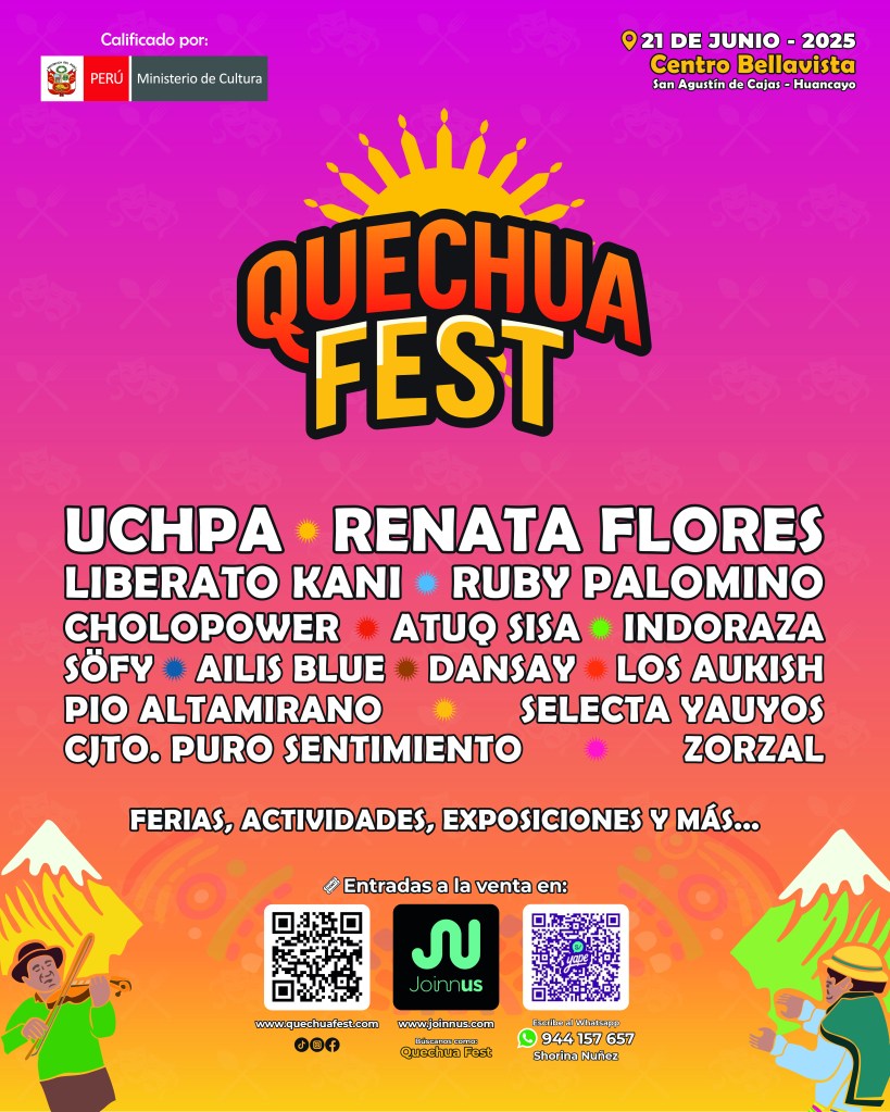 Las entradas ya están disponibles en www.quechuafest.com, en Joinnus y en el punto de venta en San Carlos 120 (frente al Mall Plaza), Huancayo. El ingreso al ritual de amanecer está incluido con la entrada general.