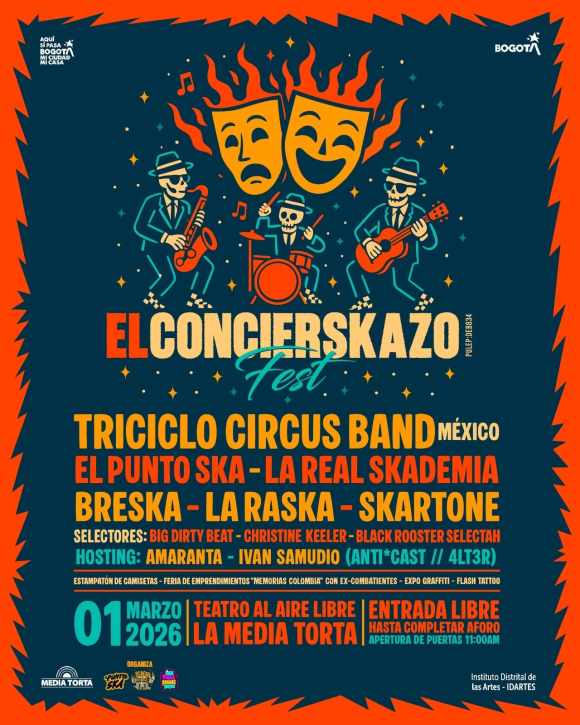 Bogotá vivirá una nueva experiencia cultural con El Concierskazo Fest 2026, un festival internacional gratuito que une ska, teatro y artes gráficas en un solo escenario. El evento se realizará el domingo 1 de marzo de 2026 en el Teatro al Aire Libre La Media Torta, con una jornada continua de 8 horas de programación, desde las 11:00 a. m. hasta las 7:00 p. m., y entrada libre hasta completar aforo.